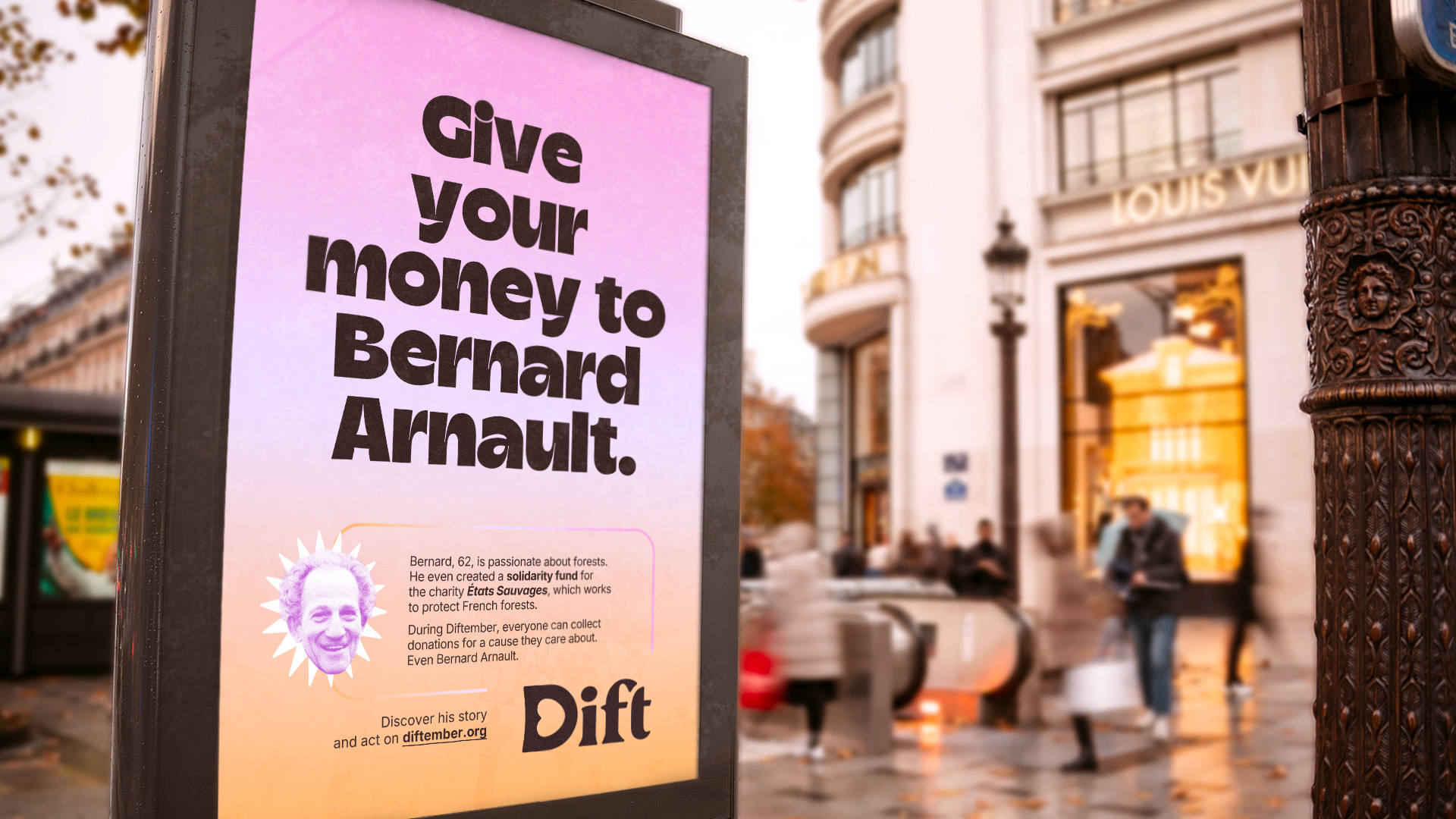 This December, Dift, the charitable fundraising platform, is launching Diftember*: the month of solidarity. To make a lasting impression, the brand is unveiling a campaign centered around one man: Bernard Arnault.